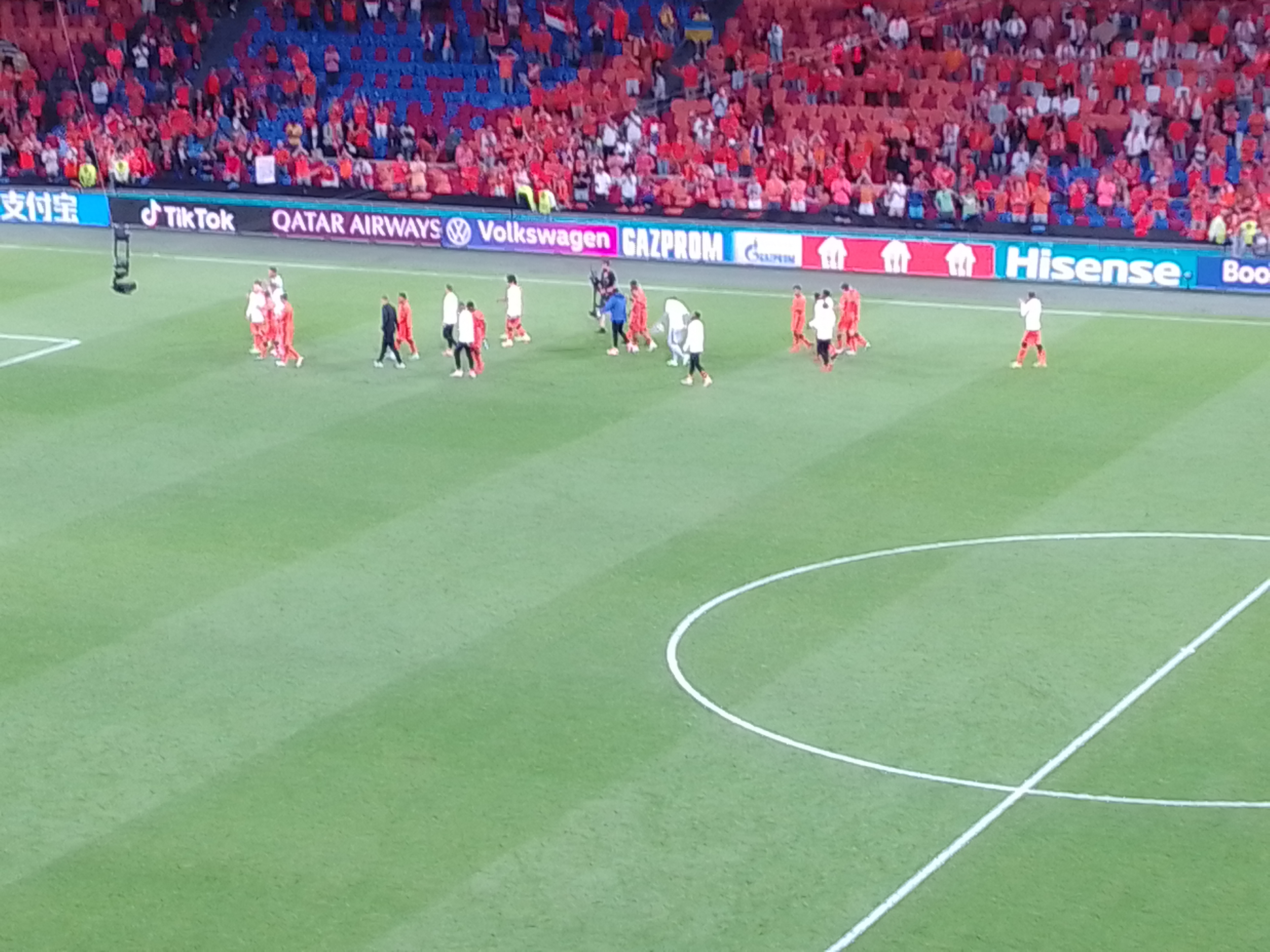 23:56 После финального свистка под оглушительный шум "оранжевого моря" трибун игроки сборной Нидерландов прошли круг почета, благодаря болельщиков. Но и наших любителей футбола, сумевших несмотря ни на что добраться до Амстердама, тоже было очень хорошо слышно. Их было несколько сотен, против примерно 15 000..