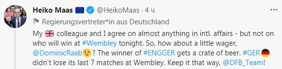 Министр иностранных дел Германии Хайко Маас поспорил со своим коллегой из Великобритании Домиником Раабом на ящик пива об итогах футбольного матча между сборными двух стран.