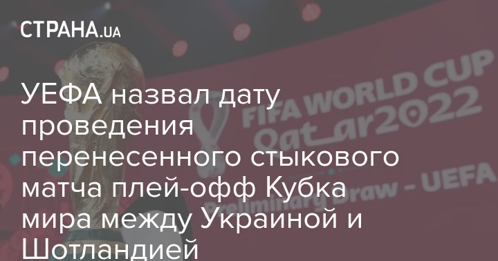 Союз европейских футбольных ассоциаций (UEFA) официально утвердил дату проведения перенесенного матча полуфинала плей-офф отбора ЧМ-2022 между сборными Украины и Шотландии.