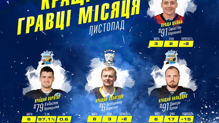 В ноябре 2019 года лучшими игроками чемпионата Украины по хоккею (УХЛ) признаны Новицкий, Алексюк и Орлов. Автором лучшей шайбы месяца стал Севастьян Карпенко. Об этом сообщает пресс-служба УХЛ.
