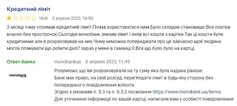Люди все частіше скаржаться, що банк їм закриває кредитні ліміти за картками. І ці історії виходять на поверхню. Наприклад, на профільному фінансовому сайті клієнт monobank опублікував скаргу на те, що банк згорнув його кредитний ліміт без попередження. При цьому у банку навіть не намагаються спростовувати цю історію, усі визнають. Наголошуючи, що банк має право обнулити кредитний ліміт, коли вважатиме за потрібне.