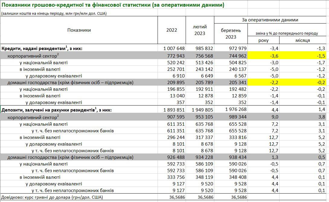 • кредитування корпоративного сектора: за березень обсяг просів на 1,5%, з початку 2023 року – на 3,6% – до 744,96 млрд грн;