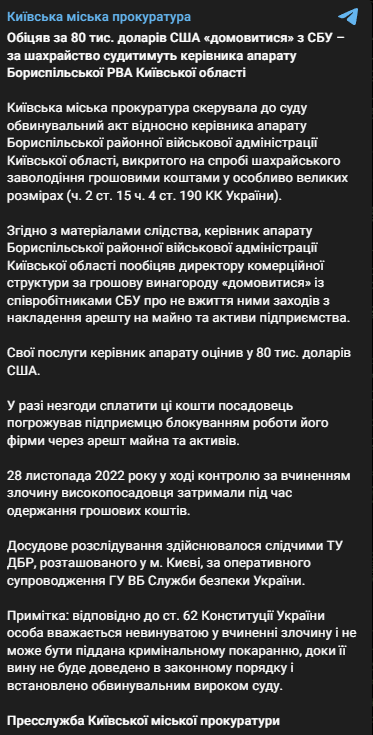 У Києві за шахрайство судитимуть керівника апарату Бориспільської районної військової адміністрації Київської області, який за 80 тис. доларів обіцяв "договоритися" із СБУ.