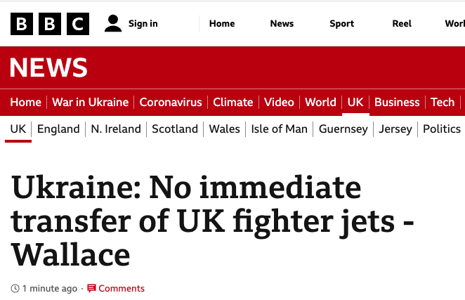 Стосовно пропозиції Бориса Джонсона передати Україні 100 бойових літаків "Тайфун" Уоллес заявив, що таке рішення має бути ухвалене широкою коаліцією країн, до того ж Британії найпотрібніші літаки для захисту себе, а також союзників - Балтії та Катару.
