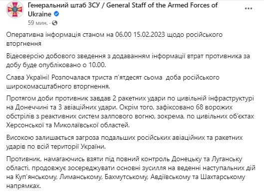 В середу, 15 лютого, Генштаб ЗСУ оприлюднив зведення про ситуацію на фронті.