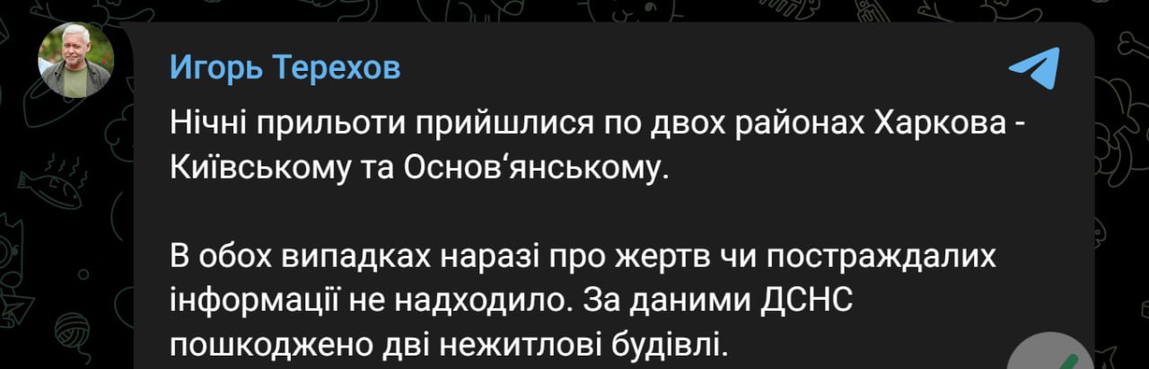 Нічні прильоти Харковом припали по двох районах міста - Київському та Основ'янському.