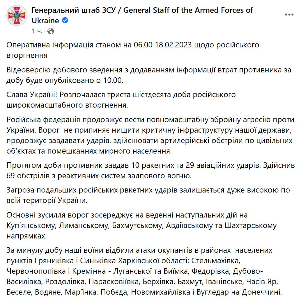 07.26 Зведення українського Генштабу на ранок 18 лютого. Головне: