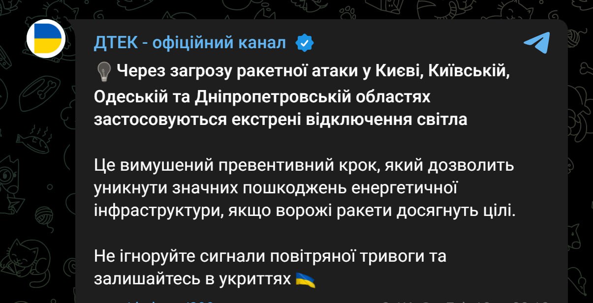 09.13 Через загрозу ракетної атаки у Києві, Київській, Одеській та Дніпропетровській областях застосовуються екстрені відключення світла. Про це повідомляє ДПЕК.