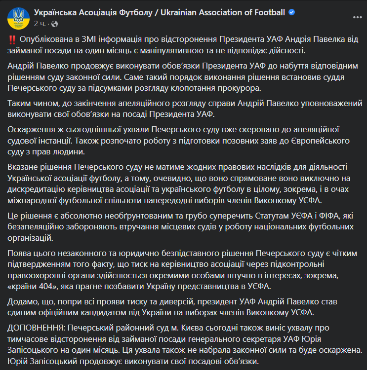 Також в асоціації заявили, що Павелко продовжує виконувати обов'язки президента УАФ "до набрання відповідного рішення суду законною силою".