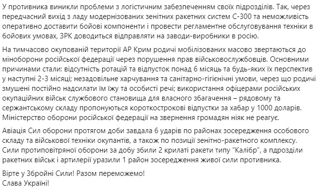 Противник завдав 9 ракетних та 11 авіаційних ударів, є загиблі та поранені серед цивільного населення. Виділяється потужний авіаційний удар у районі Бахмута.