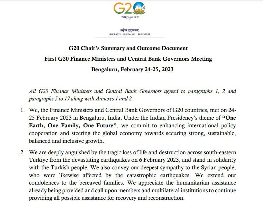 15.57 Міністри фінансів та голови центробанків G20 за підсумками зустрічі в Бангалорі ухвалили спільну заяву, з якої виключили пункти, де йшлося про засудження дій Росії в Україні.