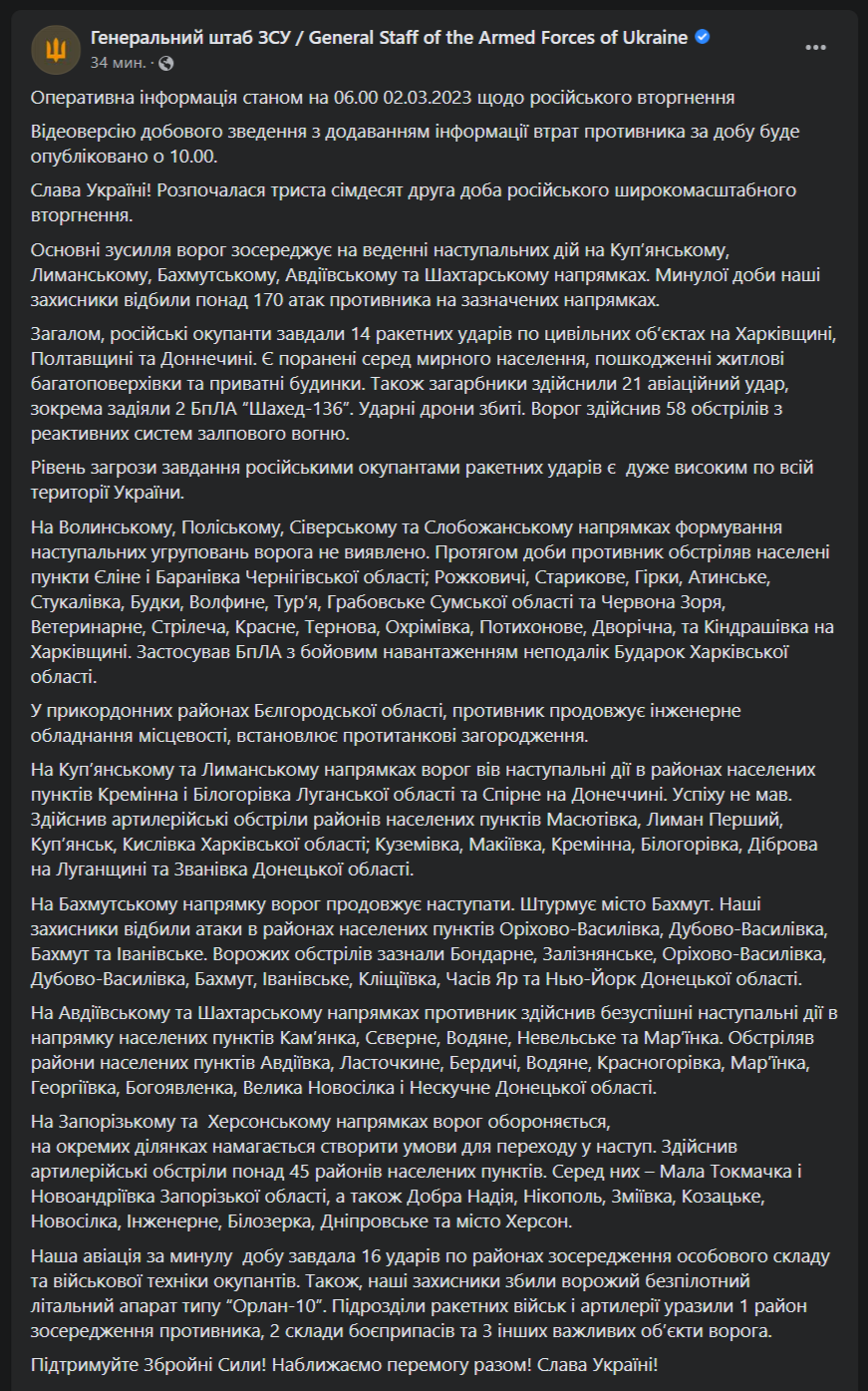 06:55 Зведення українського Генштабу на ранок 2 березня. Головне: