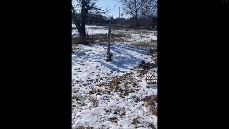 У ролику показані хрести, збиті з частин огорож. Навколо пустиря дерева посічені осколками, деякі будинки сяють випаленими вікнами.