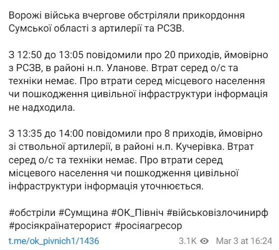 У п'ятницю, 3 березня, російські військові з артилерії та РСЗВ обстріляли прикордоння Сумської області.