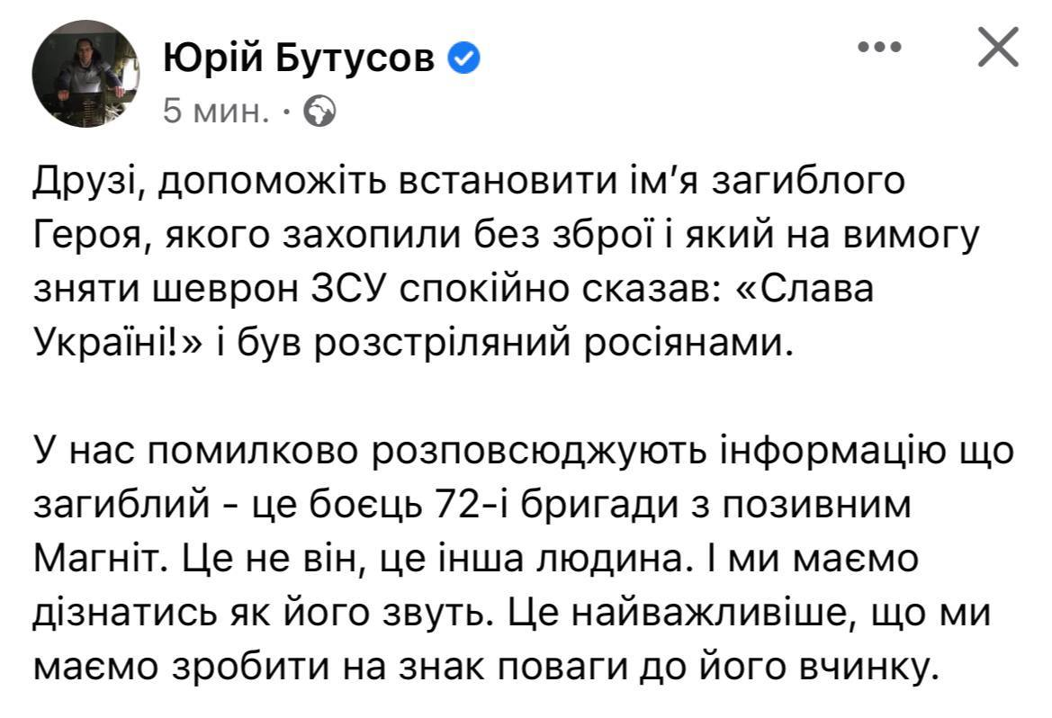Головний редактор "Цензора" Юрій Бутусов також написав, що це помилкова інформація, а розстріляна українська військова - це інша людина.