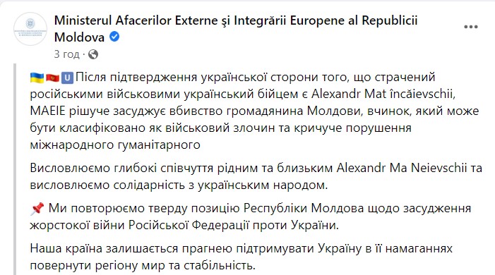 "Після підтвердження українською стороною того факту, що українським солдатом, страченим російськими військовослужбовцями, є Олександр Мацієвський, МИДЕІ різко засуджує вбивство громадянина Молдови, діяння, яке можна кваліфікувати як військовий злочин та грубе порушення міжнародних гуманітарних законів", - йдеться у повідомленні.