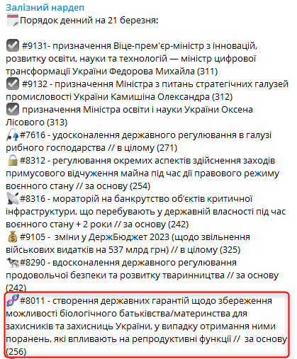"Парламент підтримав законопроект #8011 про створення державних гарантій щодо збереження можливості біологічного батьківства/материнства для захисників та захисниць України у разі отримання ними поранень, що впливають на репродуктивні функції", - повідомив він.