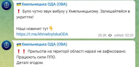 06:40 Мер Хмельницького Олександр Семчишин повідомив, що звуки вибухів, які чули жителі, були пов'язані з роботою сил ППО.