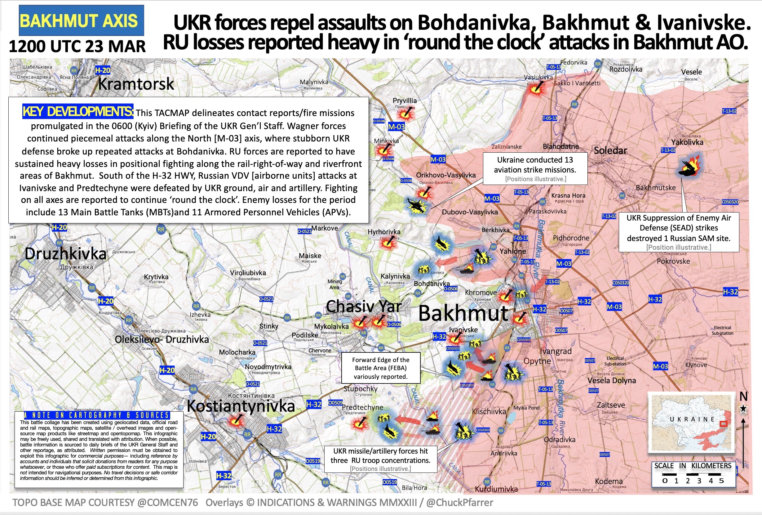 Навколо самого Бахмута росіяни просувалися, судячи з даних "Інституту вивчення війни", у південній частині міста. Водночас відбулися українські контратаки на південь від Івановського та на південний схід від Богданівки.
