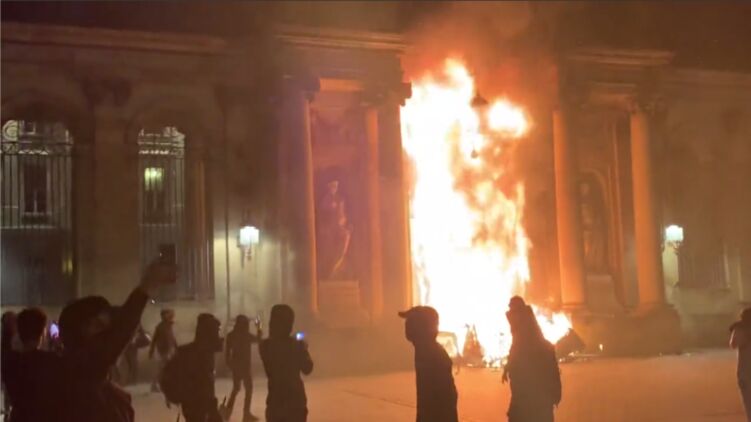 У Мережі з'явилося відео пожежі у французькому Бордо, де протестувальники проти пенсійної реформи підпалили будівлю мерії.