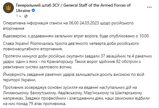 У п'ятницю, 24 березня, Генштаб ЗСУ оприлюднив зведення про ситуацію на фронті.