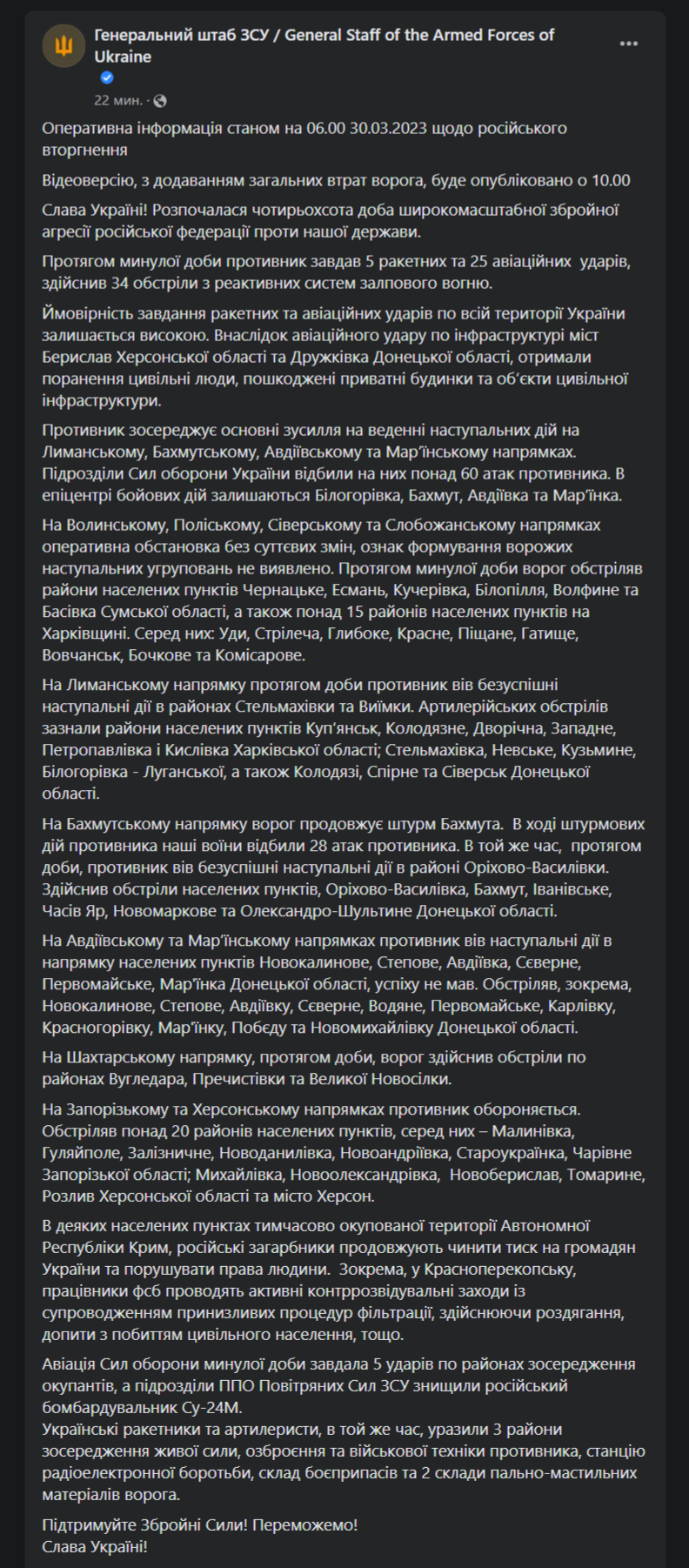 06:30 Зведення українського Генштабу на ранок 30 березня.