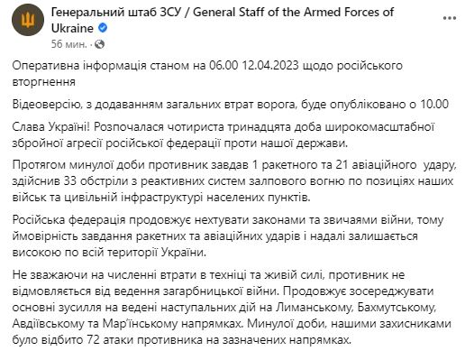 У середу, 12 квітня, в Україні триває вже 413-й день війни з Росією