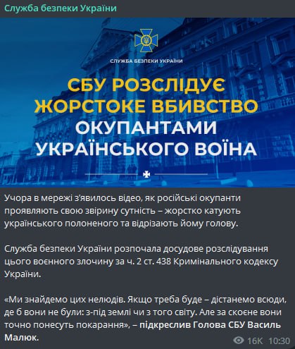 10.43 СБУ розпочала досудове розслідування за фактом публікації відео, на якому українському солдатові відрізають голову.