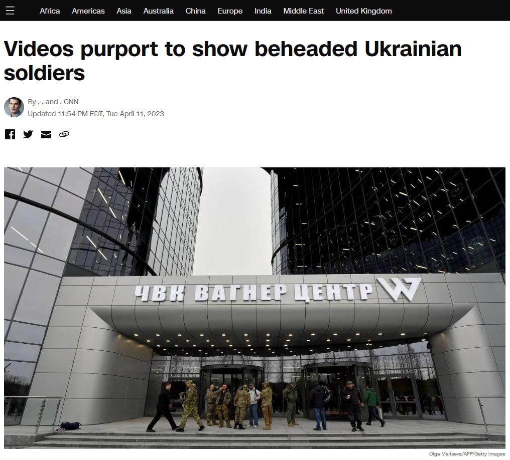 Повідомляється, що на другому відео "вагнерівці" показують, що знищили броньовану машину ЗСУ та знімають на камеру тіла двох українських військових із відрізаними головами та руками. Відео, за даними CNN, знято неподалік Бахмута.
