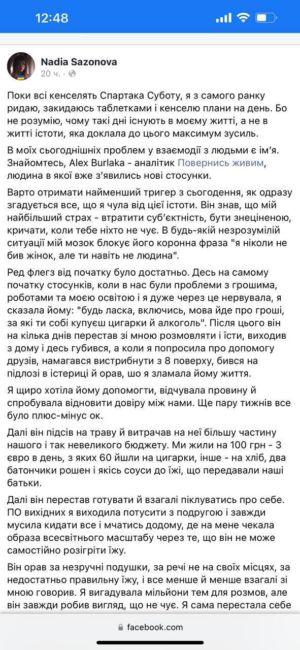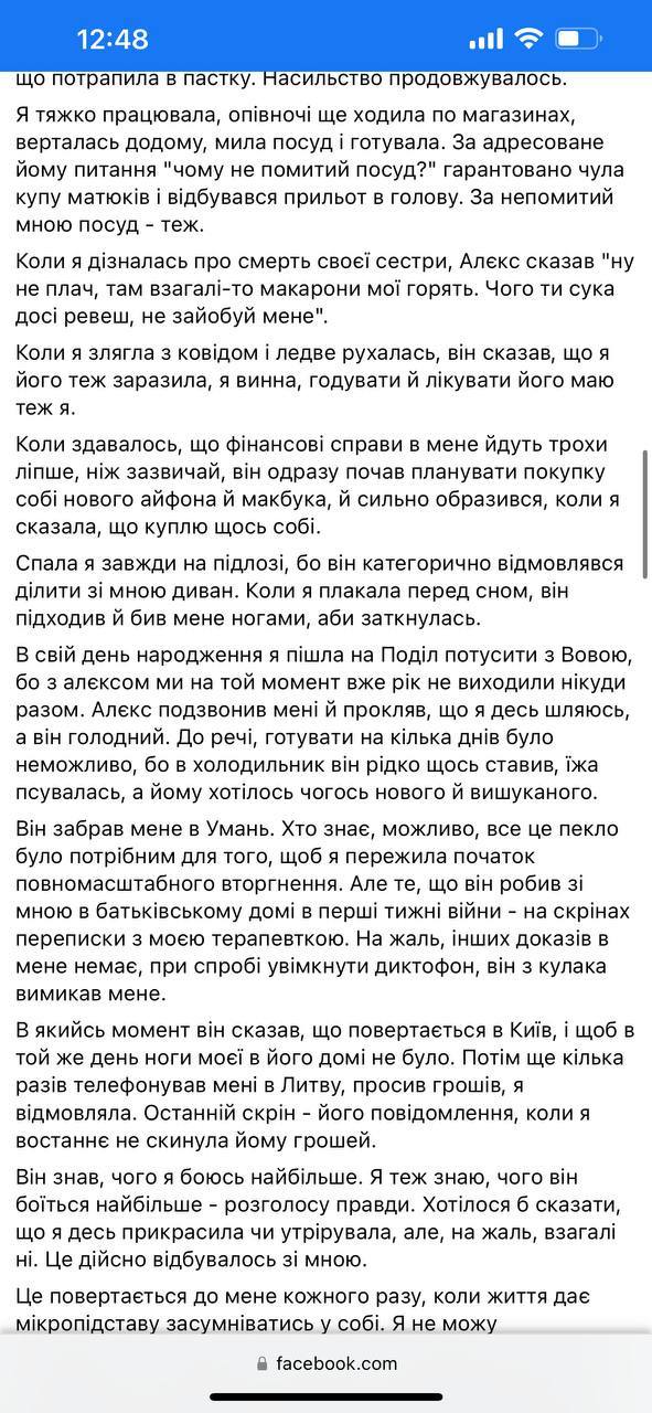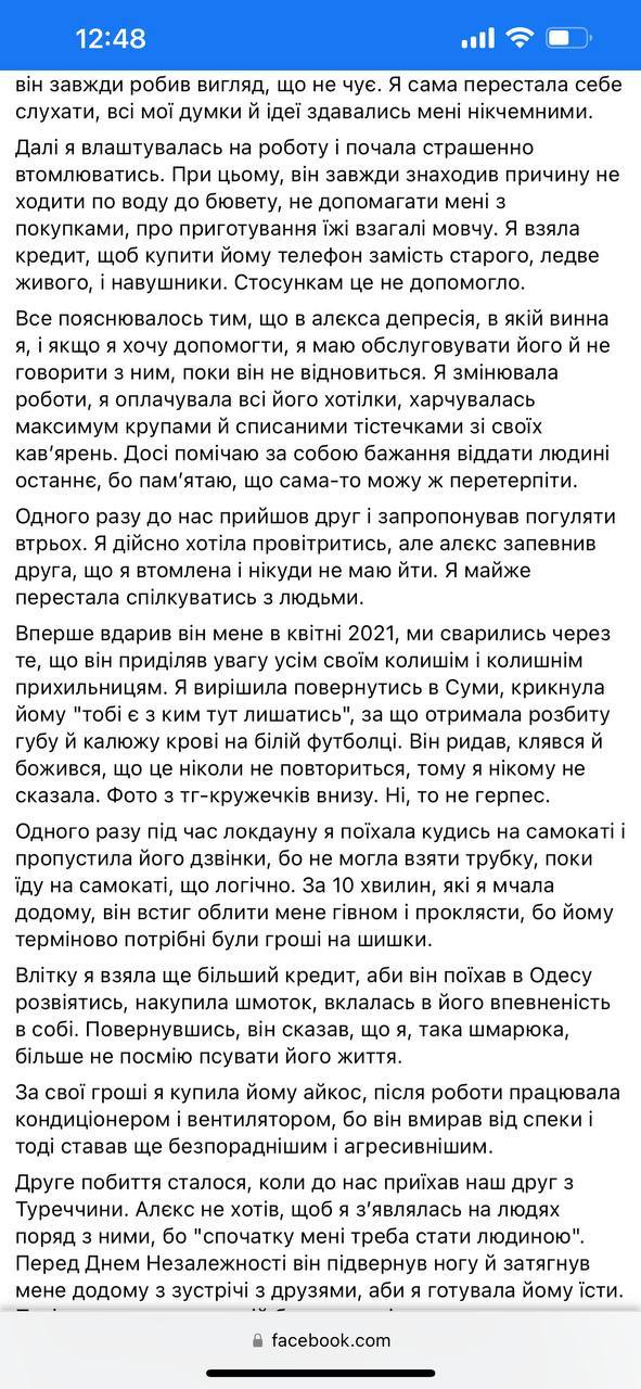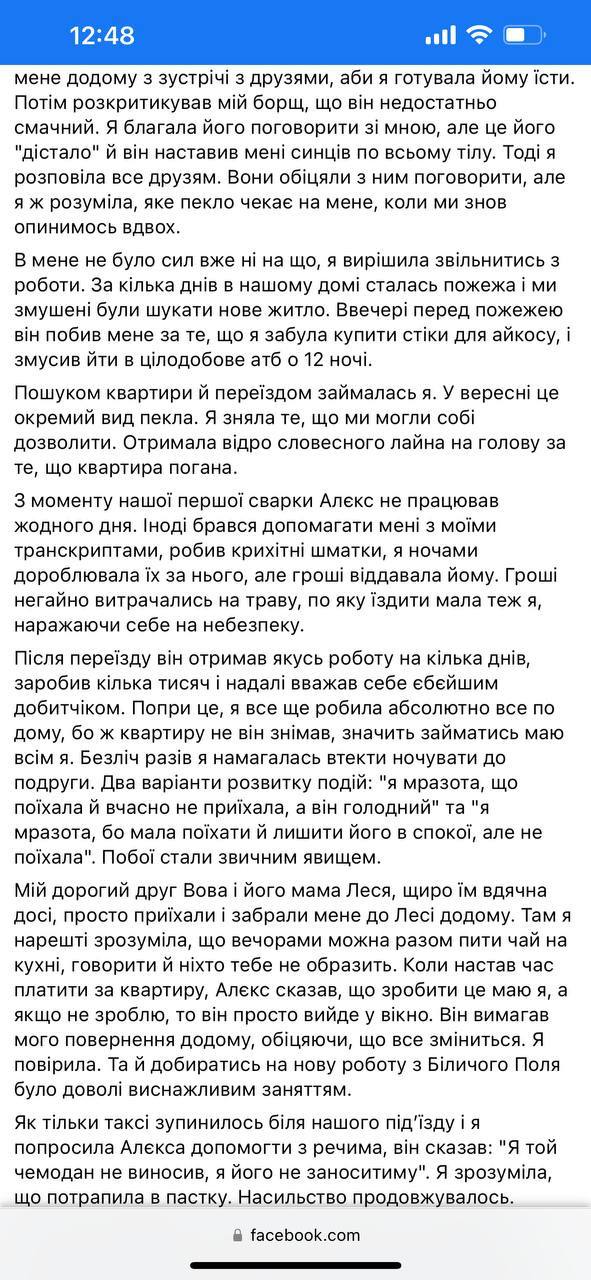 "Перед Днем незалежності він підвернув ногу і затяг мене додому з зустрічі з друзями, щоб я готувала йому їсти. Потім розкритикував мій борщ, що він недостатньо смачний. Я благала його поговорити зі мною, але це його "дістало", і він наставив мені синяків по всьому тілу.Тоді я розповіла все друзям.Вони обіцяли з ним поговорити.Але ж я розуміла, яке пекло чекає мене, коли ми знову опинимося вдвох.А через кілька днів у нашому будинку сталася пожежа, і ми змушені були шукати нове житло Увечері перед пожежею він побив мене за те, що я забула купити стіки для айкосу і змусила йти в цілодобове АТБ о дванадцятій ночі», — пише дівчина.