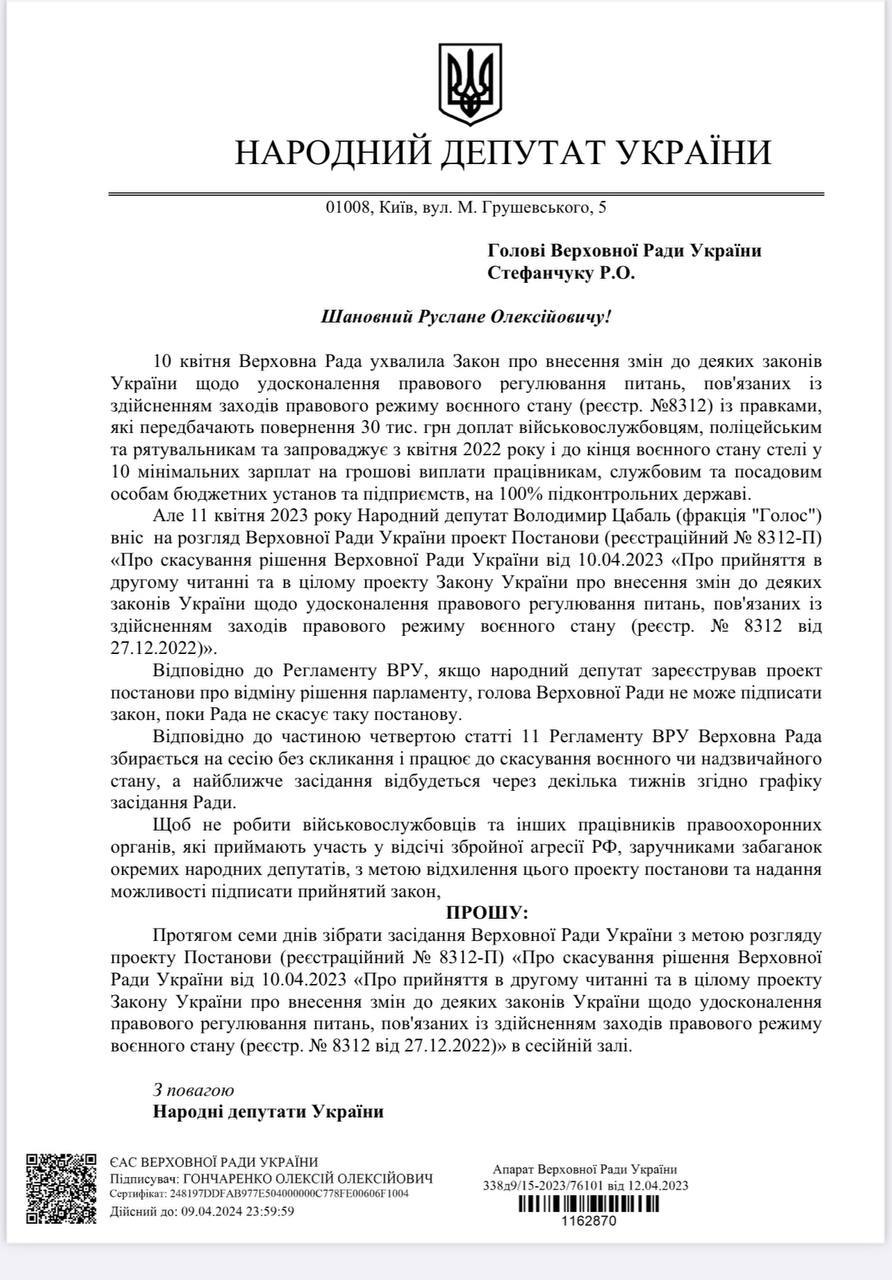 15.26 Нардеп Олексій Гончаренко направив спікеру парламенту Руслану Стефанчуку звернення з проханням протягом семи днів зібрати засідання Ради, щоб розглянути проект ухвали, який тимчасово блокує повернення виплат військовим у тилу у розмірі 30 тисяч гривень.