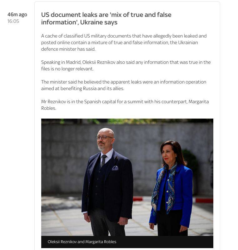 17.05 Витік документів із США — це «суміш правдивої та хибної інформації», заявив міністр оборони України Резніков.