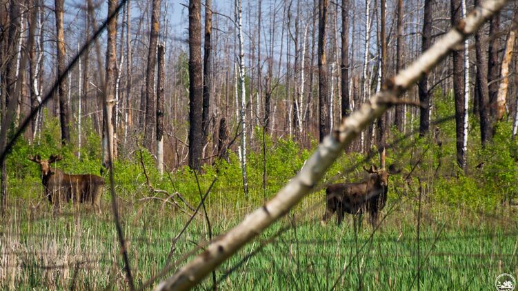 Чорнобильський радіаційно-екологічний біосферний заповідник опублікував фото двох схожих дорослих лосів, які, зважаючи на все, мирно співіснують серед свіжої зелені, яка поступово затягує місце колишнього згарища.