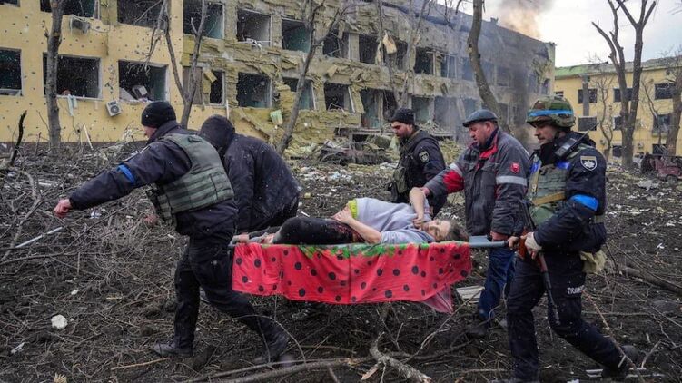 На фото вагітну жінку несуть на ношах повз зруйновані обстрілами будівлі. Жінку звали Ірина Калініна, її син Мирон народився мертвим, вона сама померла за півгодини після пологів. Їй було 32 роки.