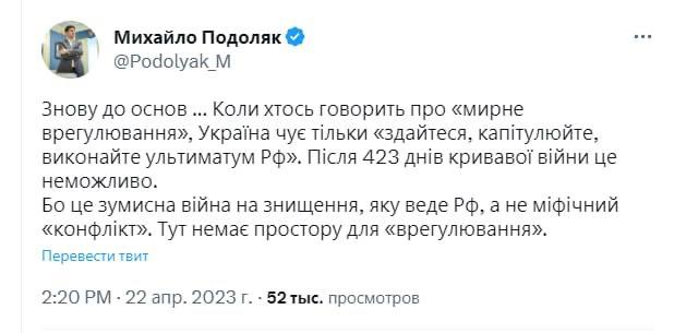 "Коли хтось говорить про мирне врегулювання, Україна чує лише одне - "здайтеся, капітулюйте, виконайте ультиматум РФ", - написав Подоляк.