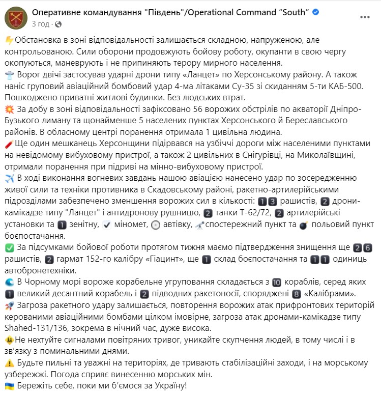 Про це повідомляє Оперативне командування "Південь" у Facebook.