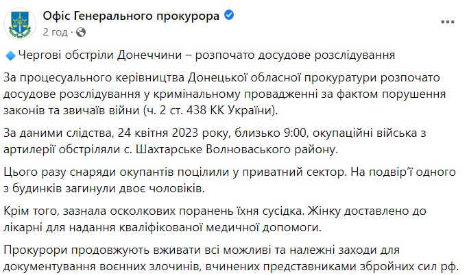 За даними слідства, двоє чоловіків загинули просто у дворі житлового будинку, коли снаряди потрапили до приватного сектору. А їхня сусідка була поранена осколком, її доправили до лікарні.