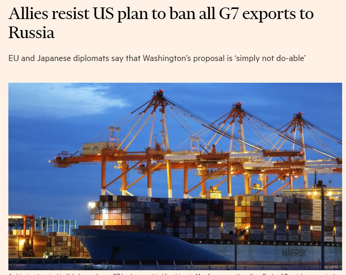 09.04 Союзники опираються плану США заборонити весь експорт G7 до Росії. Дипломати ЄС і Японії кажуть, що пропозиція Вашингтона "просто нездійсненна", пише Financial Times.