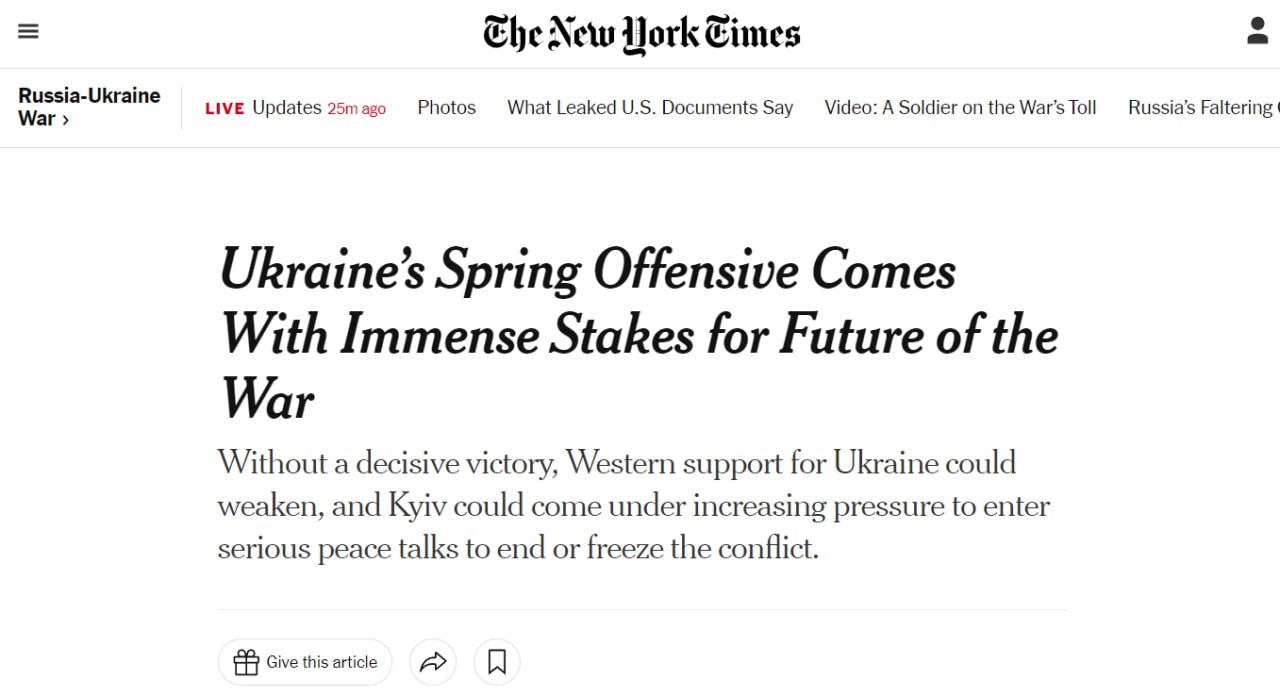 09.43 У той час, як українські офіційні особи заявляють, що контрнаступ приведе до прориву російської оборони і краху російської армії, на заході сумніваються, що наступальна операція призведе до різкої зміни становища на фронті на користь України, пише New York Times.