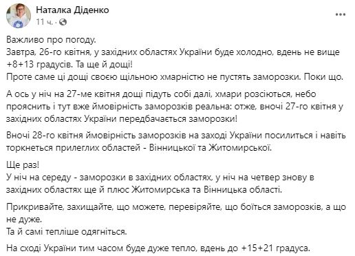 Синоптик Наталія Діденко пише, що 26 квітня у західних областях України буде холодно, вдень не вище +8...+13, дощі. Однак саме ці дощі своєю хмарністю не пустили заморозки сьогодні вночі. Проте вночі 27 квітня, коли хмари розсіються, ймовірність заморозків є реальною у західних областях України, а вночі 28 квітня і у Вінницькій та Житомирській області.