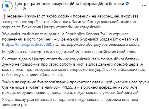 Стали відомі подробиці загибелі українського журналіста Богдана Бітика та поранення його італійської колегії Коррада Зуніно на Антонівському мості у Херсоні. Вони проігнорували попередження українських військових.