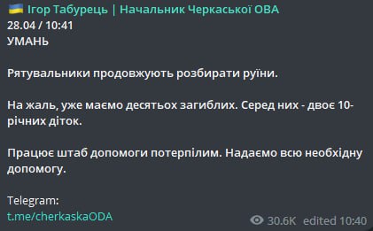 В Умані є дитина серед десяти загиблих. Згідно з повідомленнями у соцмережах, йому було 3-4 роки.