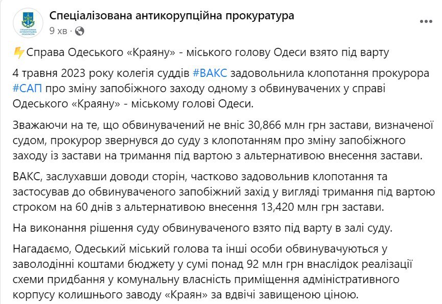 Як повідомили у САП, одеський міський голова Геннадій Труханов та інші особи звинувачуються у заволодінні коштами бюджету на суму понад 92 млн грн у результаті реалізації схеми придбання у комунальну власність приміщення адміністративного корпусу колишнього заводу "Краян" за вдвічі завищеною ціною.