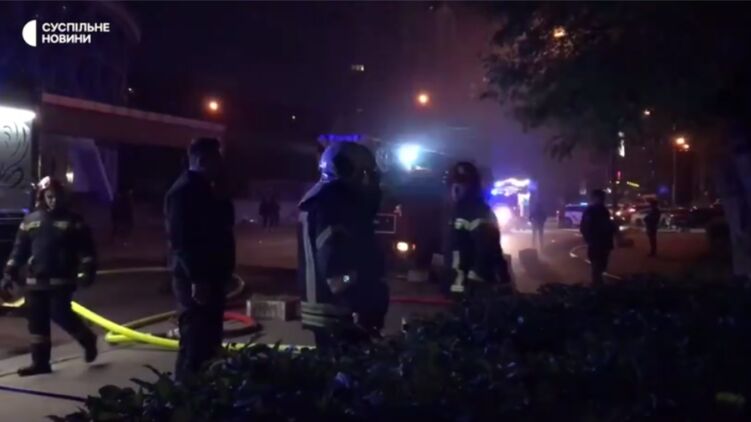 Вибуховою хвилею розбито скло ТЦ. З'явилося відео роботи рятувальників на місці падіння безпілотника у Києві
