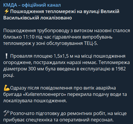 У телеграм-каналі КМДА пишуть, що пошкодження трубопроводу сталося сьогодні близько 11:10 під час гідравлічних випробувань тепломереж. У результаті утворився провал 1,5х1,5 метрів, "постраждалих поки що немає". На даний момент фонтан локалізований