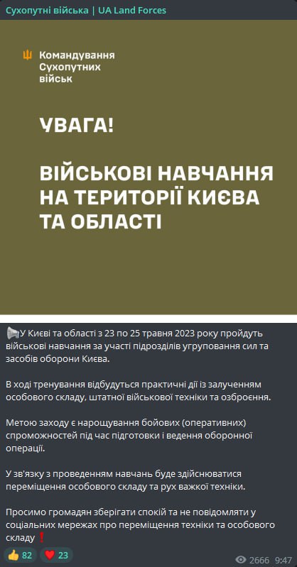 У Києві та області з сьогоднішнього дня, 23 травня, та по 25 травня пройдуть військові навчання за участю підрозділів угруповання сил та засобів оборони столиці.
