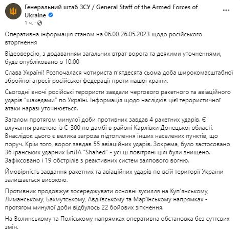У п'ятницю, 26 травня, Генштаб ЗСУ оприлюднив зведення про ситуацію на фронті.