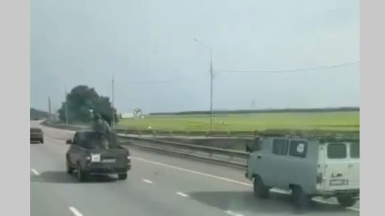 На кадрах можна побачити просування трасою військових машин, у яких перебувають озброєні найманці.