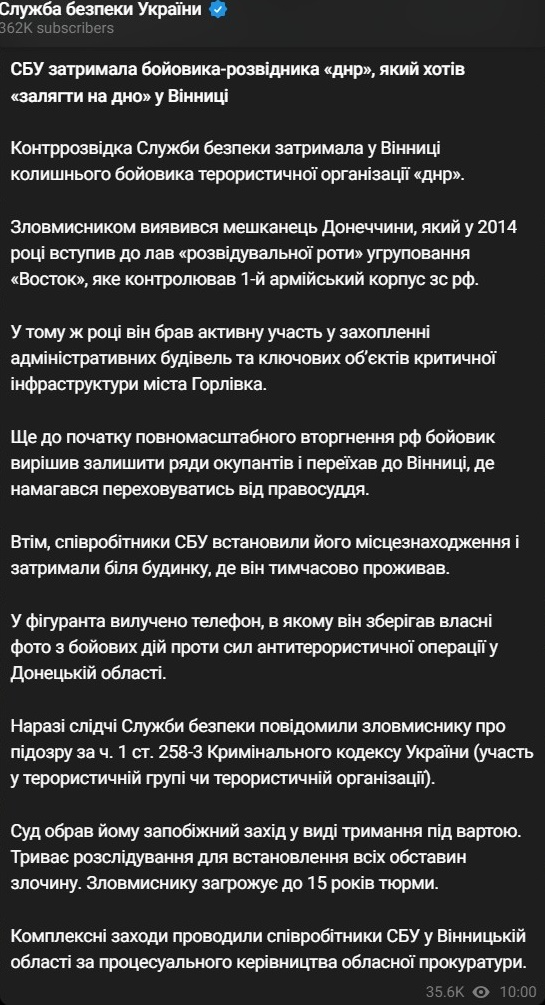 В результаті операції контррозвідки Служби безпеки України (СБУ) у місті Вінниця був затриманий житель Донбасу, який воював раніше за "ДНР".