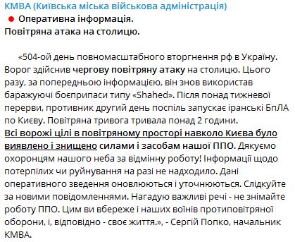 Повітряна тривога тривала понад дві години. Усі цілі в повітряному просторі навколо Києва були виявлені та знищені силами ППО. Інформації про постраждалих чи руйнування на даний момент не надходило.